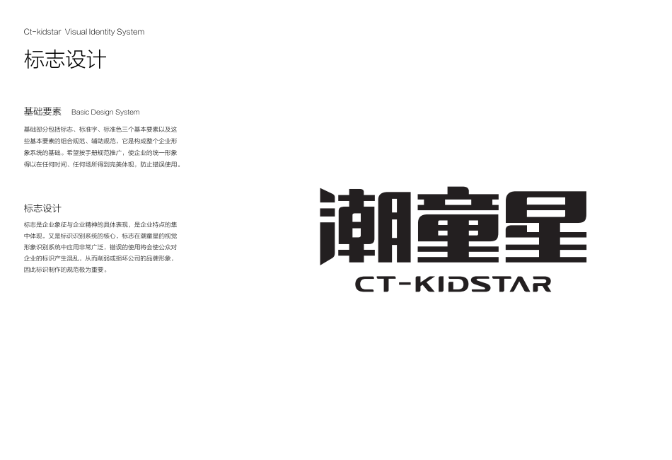 本次对外公布的“潮童星”全新品牌形象,以“潮童星”三个中文字为标志主体,以“CT-KIDSTAR”为辅助元素,制定了标志的特定色彩效果及标准色、辅助色等色彩应用规范,简称中英文字体标准和组合等日常使用规范。为了体现潮童星主营特色业务还设计了核心宣传语:走出星未来的,此外,对“潮童星”办公事物用品、公共关系赠品、服饰、标识指示、广告宣传等识别系列都做了详尽的规范标准。